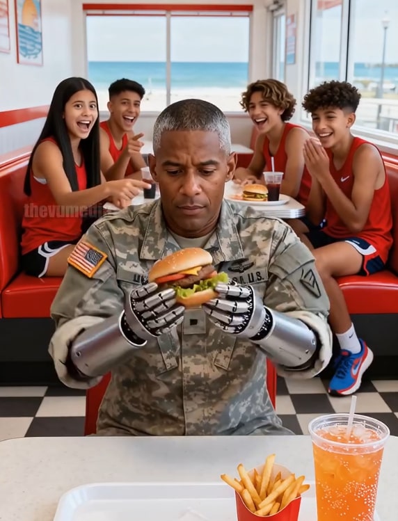 Inside a small seaside diner, laughter echoed from a corner booth. A group of teenagers in bright red uniforms were enjoying their meal when a U.S. Army veteran walked in. His uniform told a story of honor, courage, and sacrifice — but what caught everyone’s attention weren’t his medals… it was his arms.