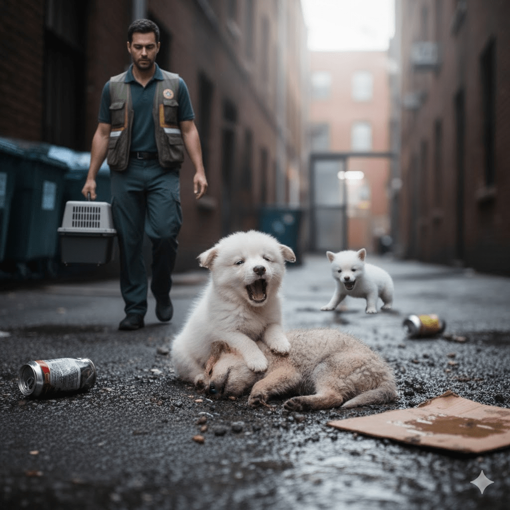 The rain had stopped hours ago, leaving the alleyway slick and cold, reflecting the gray dawn. Amidst the discarded refuse and shadows, a tiny white puppy, no…