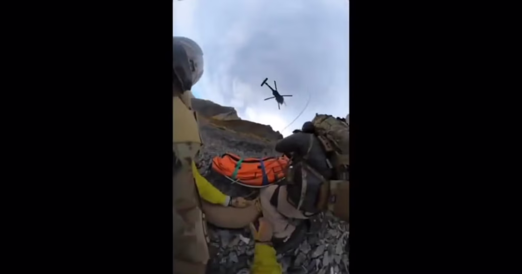 Amid the ruins and dust , a rescuer hangs from the shattered wall — not searching for glory, but for life.