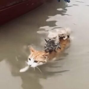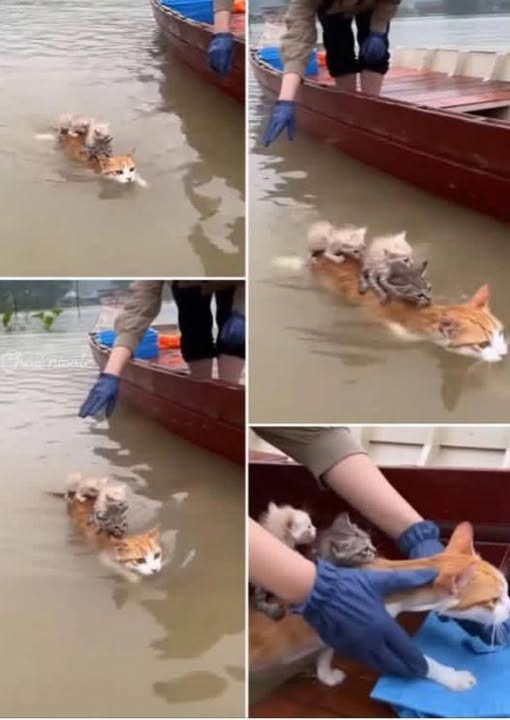 CLOSE UP MIRACLE: A brave Mother Cat swimming through the Fl.oo.dwa.ters with her 3-Kittens her back!