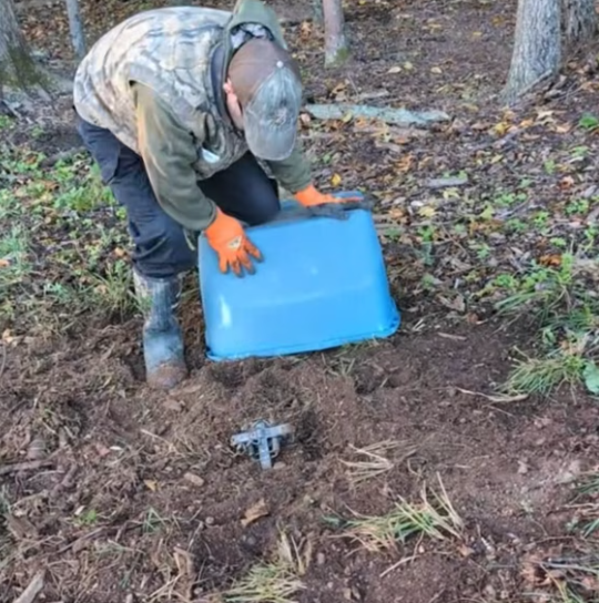 After hours of futile struggle to free itself, the wild animal was discovered by a person wearing a green jacket and sturdy orange gloves. He was holding a blue plastic bucket in his hand, perhaps to use it as protection or assistance during the operation.