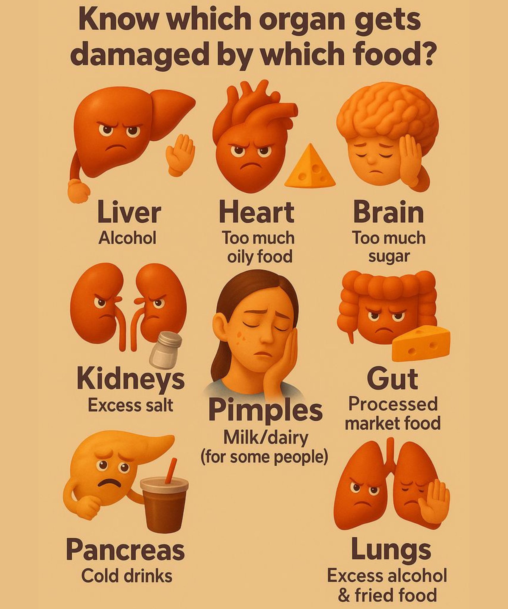 Eating the wrong foods can take a toll on different organs in our bodies. Here’s a quick guide to which organ gets damaged by which foods: