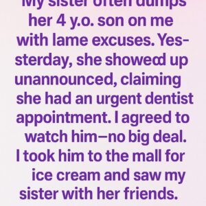 My sister often dumps her 4 y.o. son on me with lame excuses. Yesterday, she showed up unannounced, claiming she had an urgent dentist appointment. I agreed…