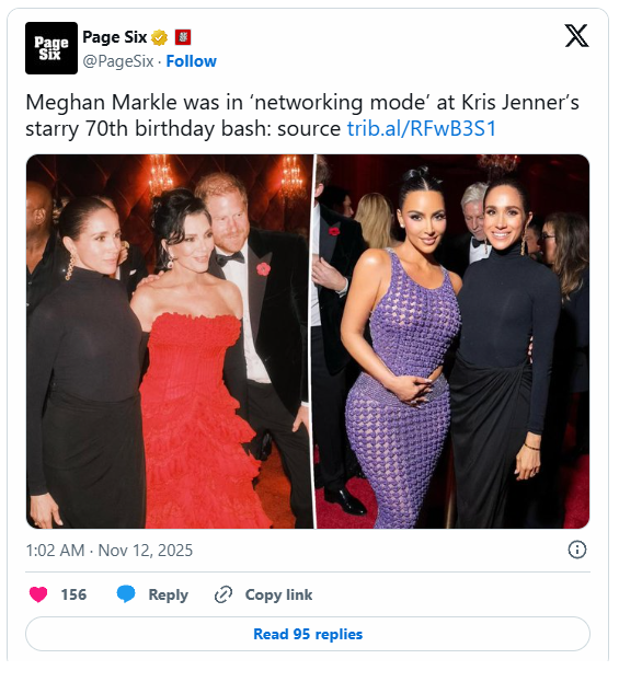 Inside the celebration, Meghan was photographed alongside Kim Kardashian in now-deleted images that had been shared on Kim’s Instagram account. Both Kim and her mother, Kris, quietly removed the photos featuring Meghan and Harry from their birthday posts.