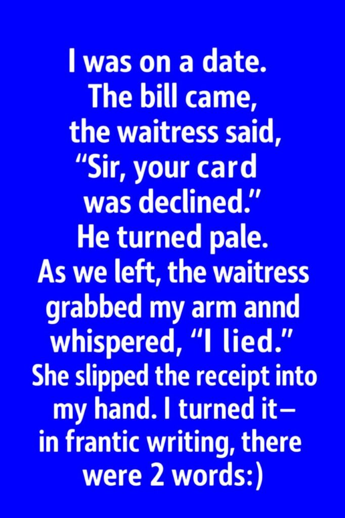 I looked up and scanned the restaurant windows. The waitress was standing behind the counter, watching me with wide, urgent eyes. When she saw that I’d read the message, she subtly mouthed something: