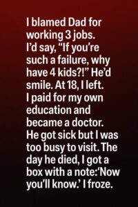 I found the small wooden box while sorting through my father’s things, hidden behind old jackets that still smelled faintly of motor oil and aftershave. Inside was a leather folder I remembered from childhood—one he kept close but never explained. When I opened it, the first thing I saw was a letter written in the same careful handwriting he used on every birthday card. His words revealed a truth I had been too young—and too self-absorbed—to understand. After my mother died, he wasn’t choosing work over us; he was choosing survival. He wrote about the endless shifts, the exhaustion, the loneliness of coming home after we were asleep, and how every extra hour worked meant another bill paid, another meal on the table, another chance for us to grow without fear.